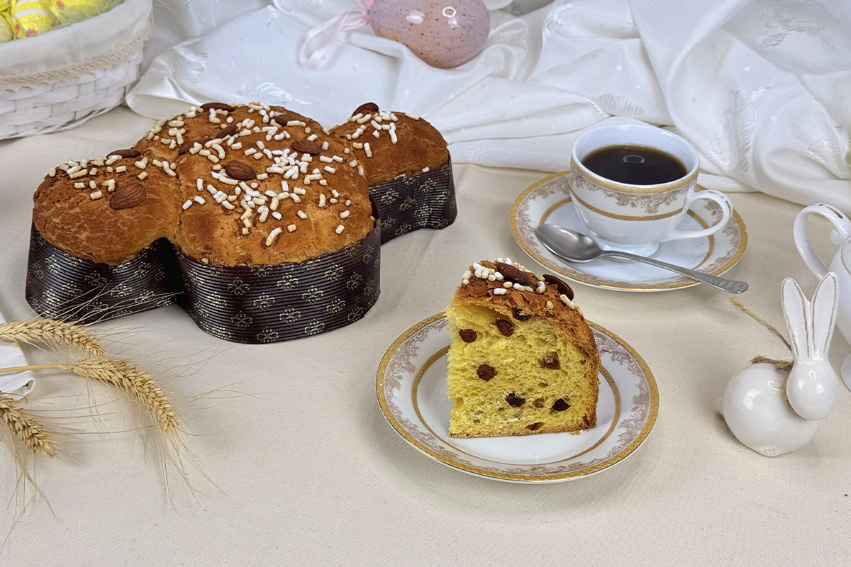 Кулич "Пасхальный голубь" - настоящее лакомство. Мягкое и нежное сдобное тесто с апельсиновыми цукатами и изюмом. Сверху покрыто запеченной хрустящей сахарно-рисовой глазурью. Посыпано гранулами кристаллического сахара и миндалем.