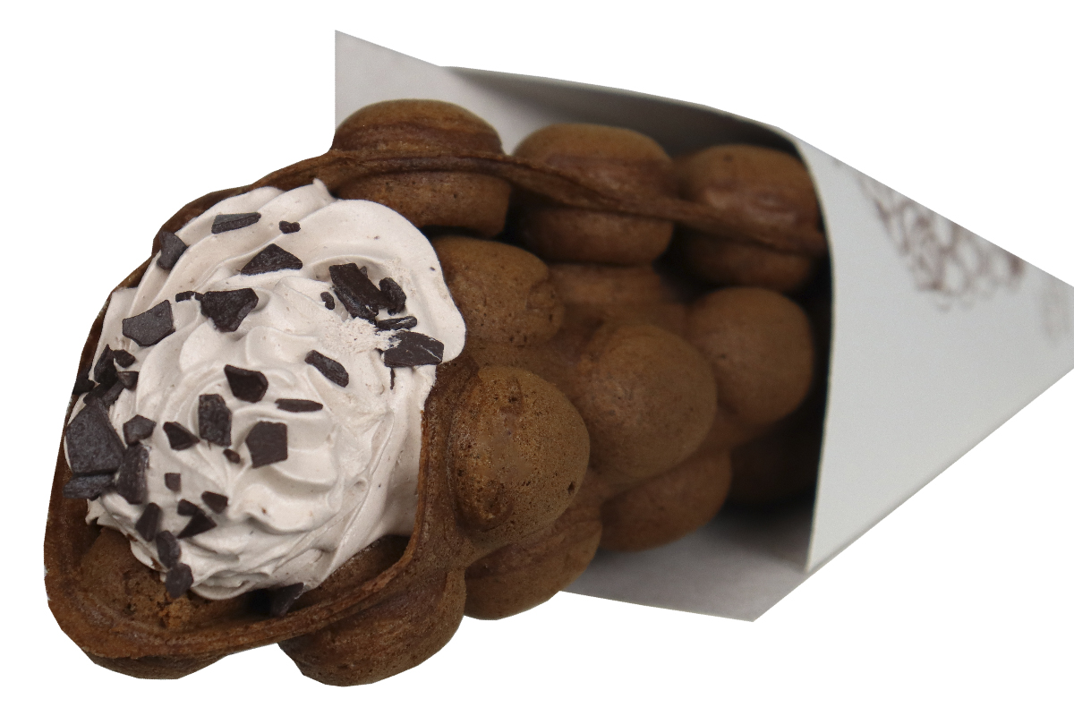 Сдобная мягкая вафля с какао свернута в форме конуса. Заполнена взбитыми сливками с шоколадно-ореховой пастой. Посыпана шоколадной стружкой.