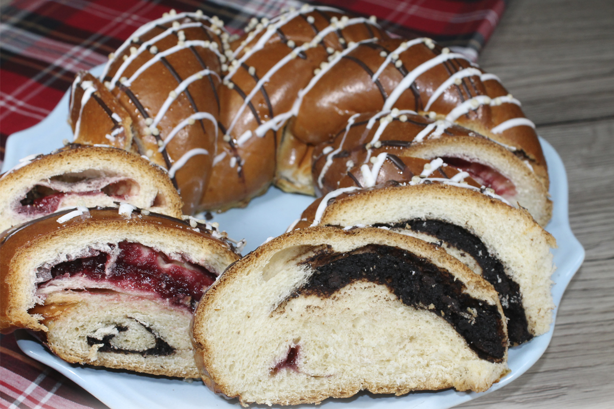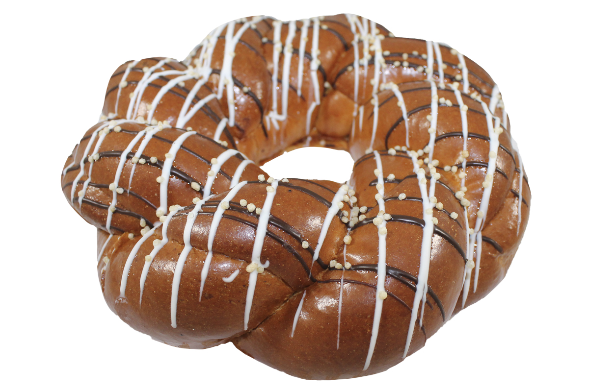 мука пшеничная хлебопекарная высшего сорта, вода питьевая, начинка вишневая, начинка шоколадная , сахар, смесь для сдобных изделий (мука пшеничная, соль поваренная, сахар, сыворотка сухая, клейковина пшеничная сухая, лактоза, декстроза, ароматизаторы идентичные натуральным, краситель бета-каротин, антиокислитель аскорбиновая кислота, ферменты), глазурь белая, глазурь шоколадная, масло подсолнечное, дрожжи хлепопекарные, яйца куриные, рис воздушный
