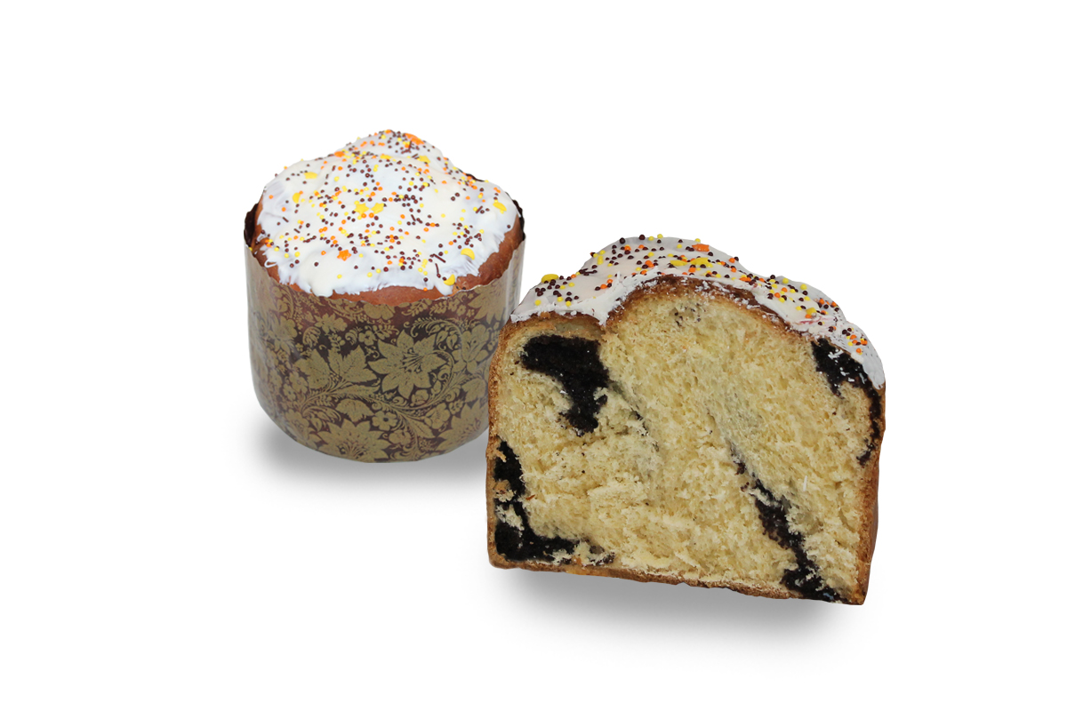 мука пшеничная хлебопекарная высшего сорта, вода питьевая, сахар, мак, глазурь белая шоколадная (сахар, заменитель какао-масла, лецитин соевый, сухая молочная сыворотка, молоко сухое цельное, ароматизатор ванилин), маргарин молочный, смесь ванильная козонак, дрожжи хлебопекарные, яйца куриные, посыпка карамельная, соль поваренная пищевая, ванилин.