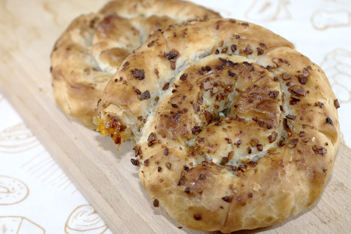 Тесто: мука пшеничная хлебопекарная высшего сорта, вода питьевая, соль поваренная пищевая йодированная, клейковина пшеничная, рафинированное подсолнечное масло, яичный порошок, сливки на основе растительных масел, сухая сыворотка, сухое обезжиренное молоко.